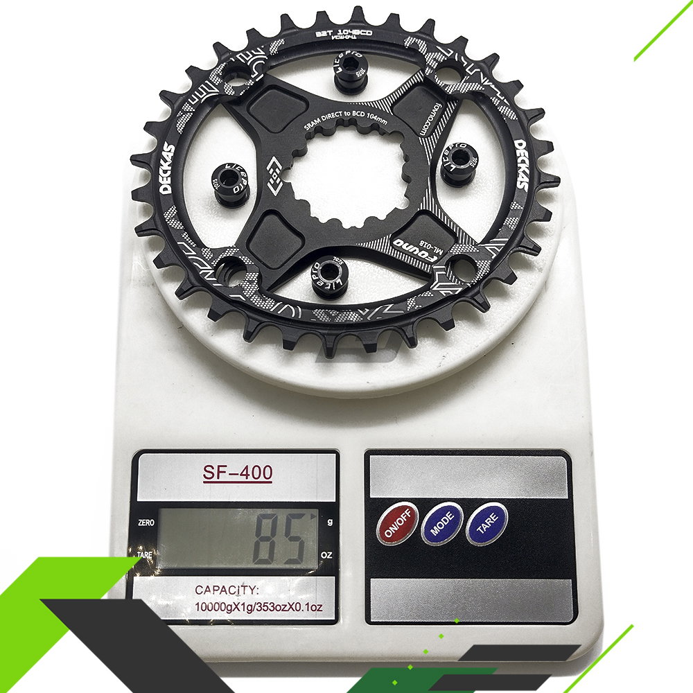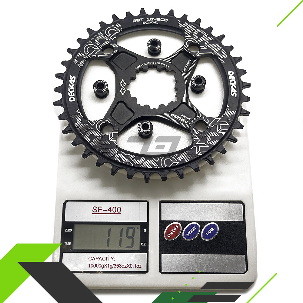 Pesos del conjunto dependiendo los dientes del monoplato (ovalado o redondo) colocando tornillos de aluminio y un monoplato Deckas (Estos ultimos dos estan disponibles en nuesta tienda). (Este peso puede variar):