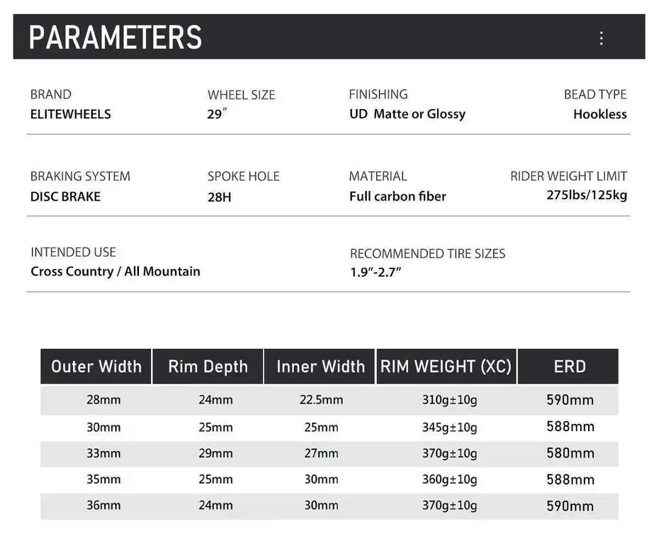 Par de AROS de fibra de carbono ELITEWHELLS rodado 29 para MTB.